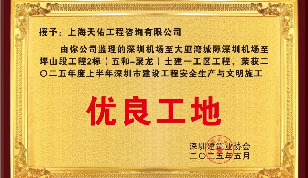 近日,由同济科技·天佑咨询提供监理服务的深大城际铁路深圳机场至坪山段工程 2 标再传捷报——项目荣获“深圳市建设工程安全生产与文明施工优良工地”荣誉称号。